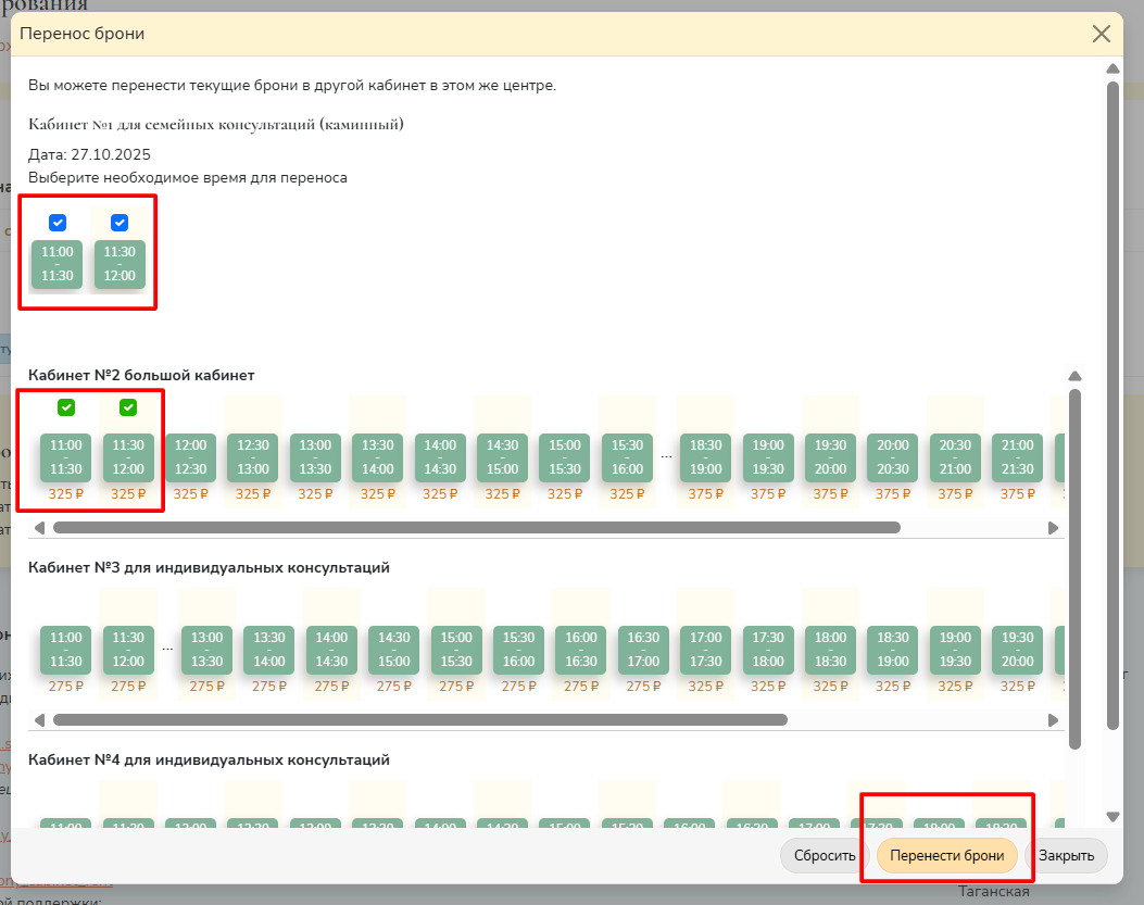 2. Выберите необходимые слоты и новый кабинет, затем подтвердите действие.