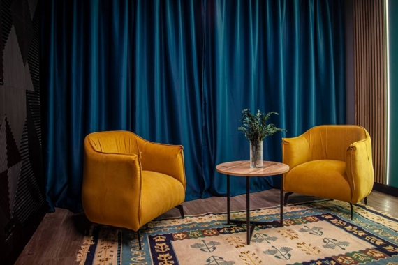 Студия «Индиго» — просторная подкаст студия для записи видео и интервью площадью 32 м². Здесь могут комфортно разместиться до 8 человек, поэтому студия идеально подходит для групповых подкастов, дискуссий, интервью и видеошоу. Интерьер с глубокими оттенками создаёт выразительную визуальную атмосферу для записи контента. Аренда студии начинается от 1200 ₽ в час.