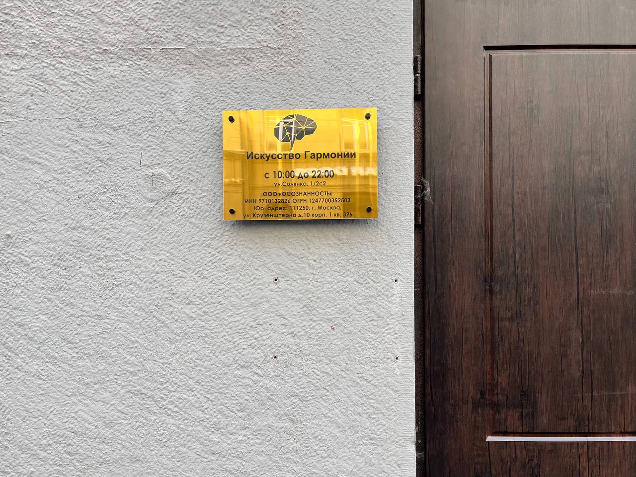 Слева от двери вывеска «Искусство Гармонии». Код домофона: 0205#