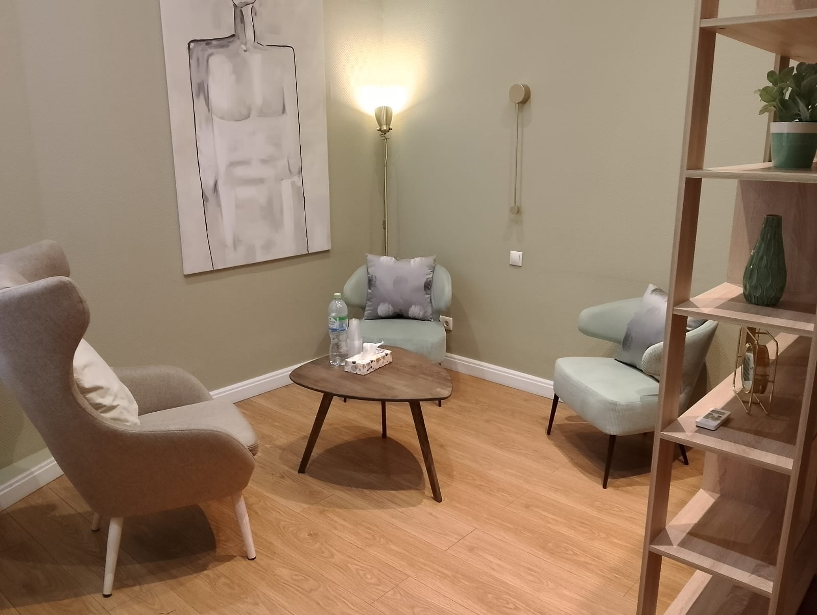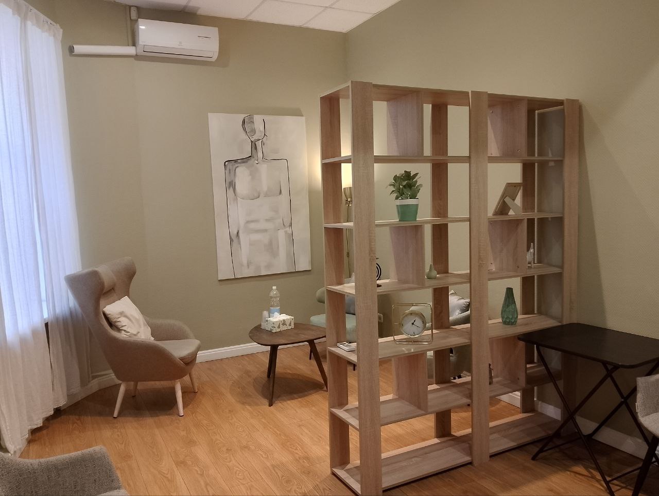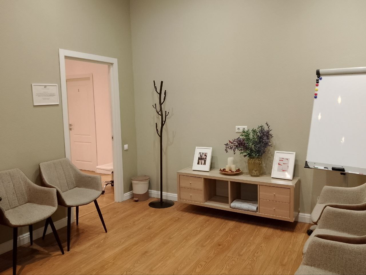 Преимущества нашего кабинета «Кремовый»: Зал трансформер идеально подходит для индивидуальных, семейных консультаций, а так же для работы с группой до 8 человек. Зал трансформер — это значит можно увеличить пространство, если передвинуть стеллаж-перегородку.