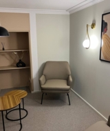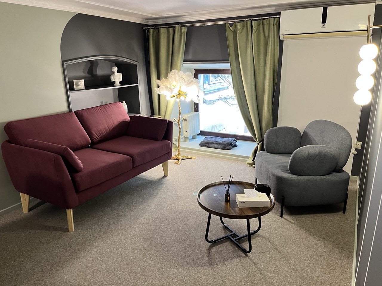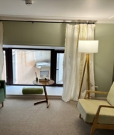 Кабинет с большим окном, выходящим во двор, диваном, креслом, рабочим столом со стулом. Кабинет подойдет для индивидуальных и семейных консультаций.