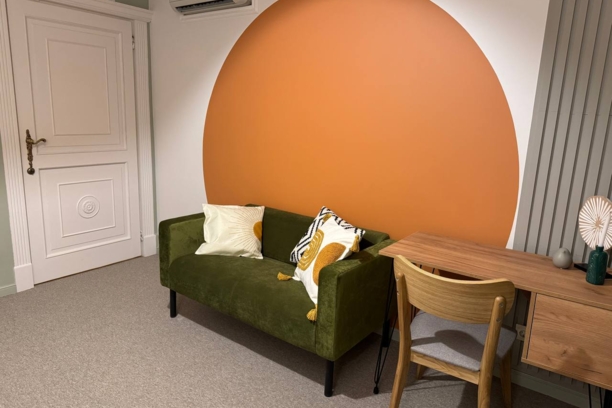 окном, выходящим во двор, диваном, креслом, рабочим столом со стулом. Кабинет подойдет для индивидуальных и семейных консультаций.