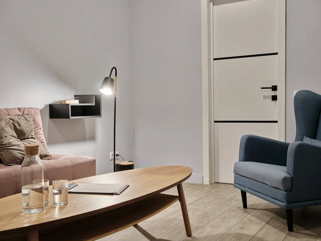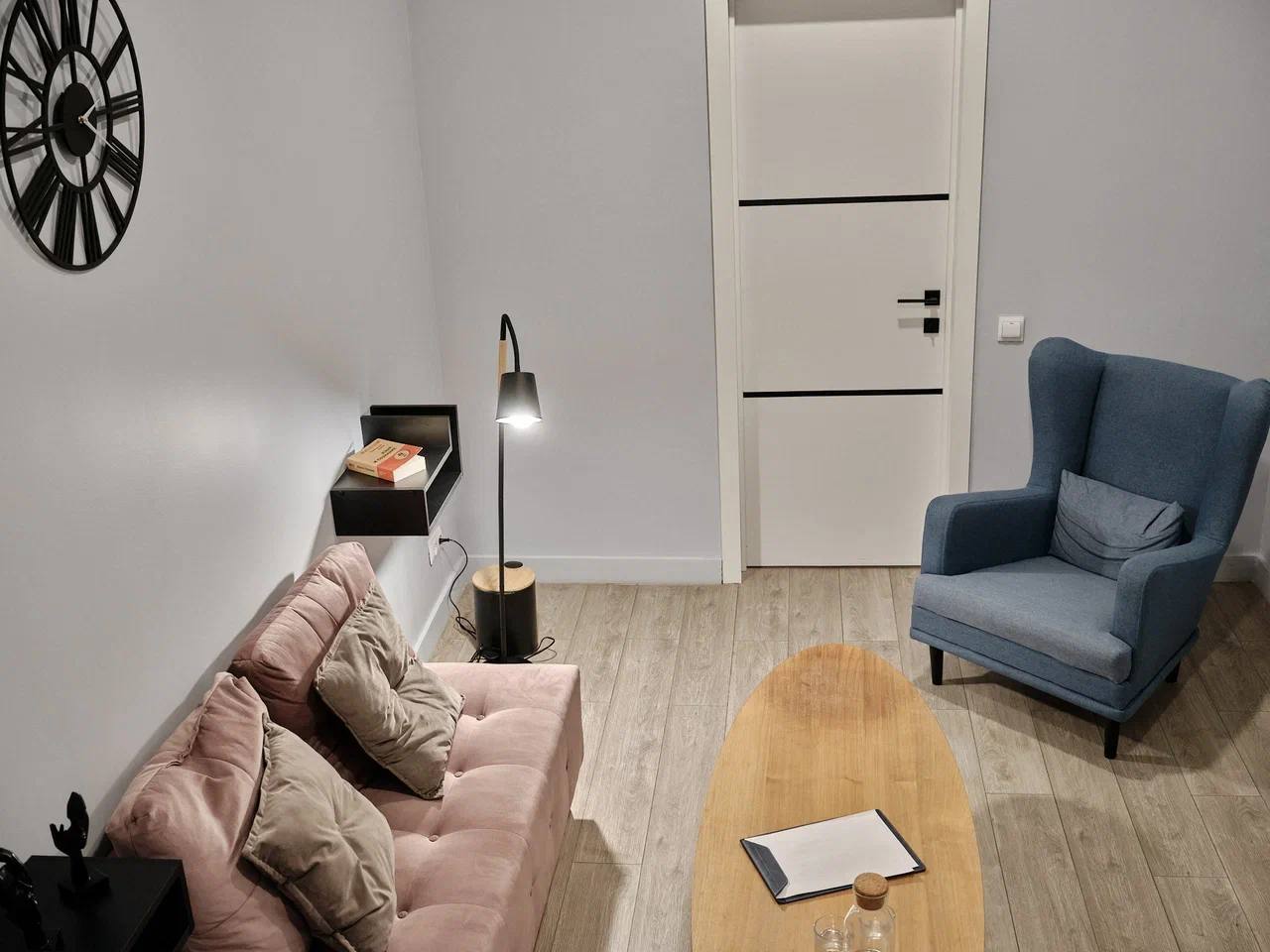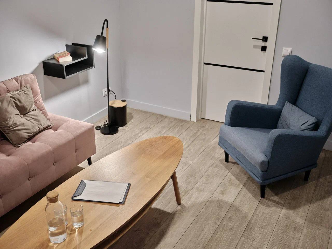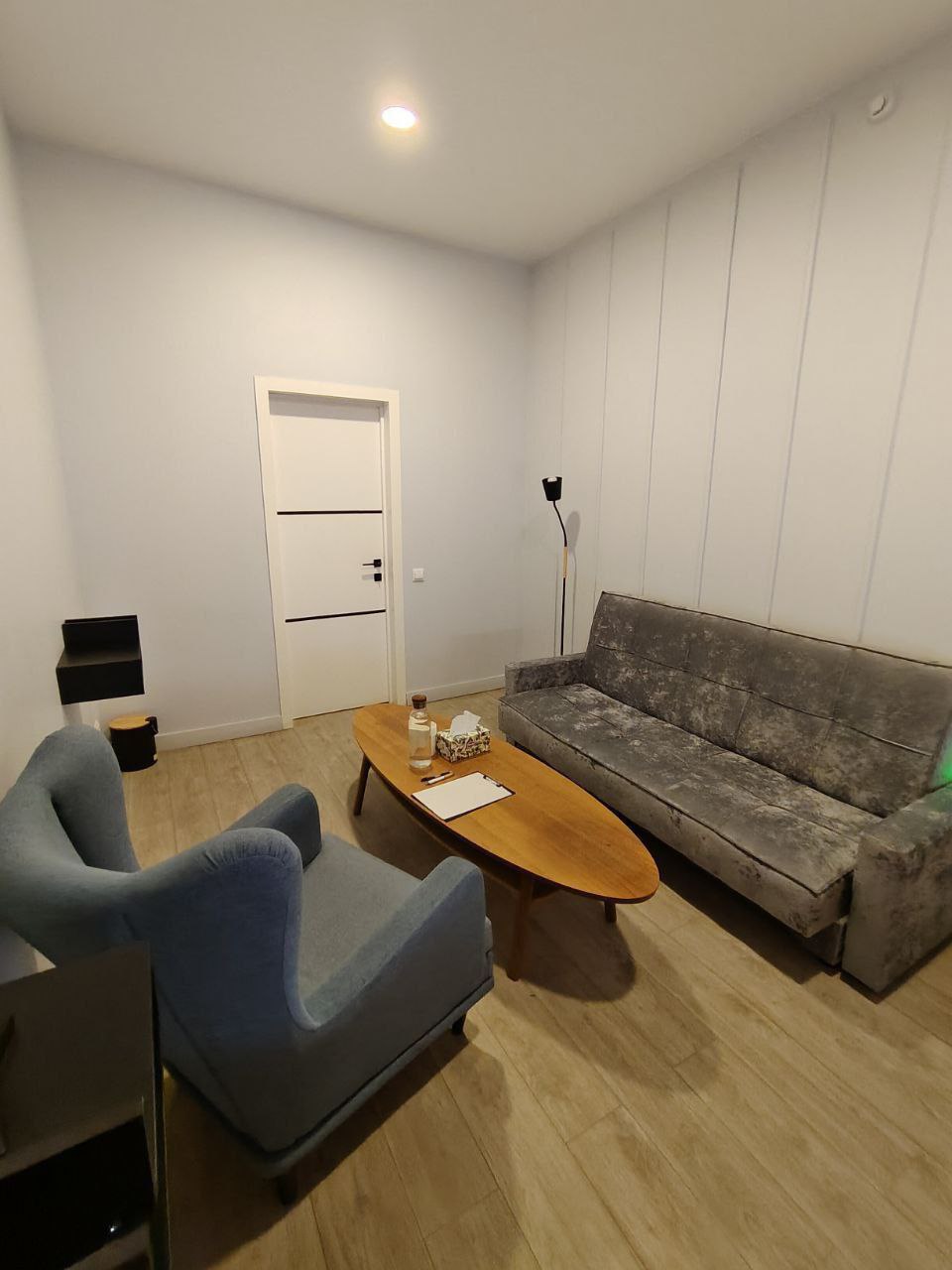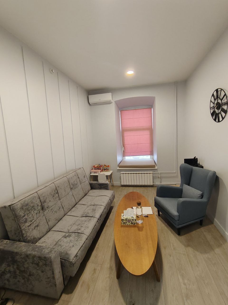 Просторный кабинет, выполненный в пастельном, голубом оттенке. Оборудован диваном, удобным креслом, детским столиком и стульчиком и кондиционером. По запросу мы предоставим детский мольберт для арт- терапии. Большой стол подойдет для образных техник и работы с Мак картами. Возможна регулировка освещения.