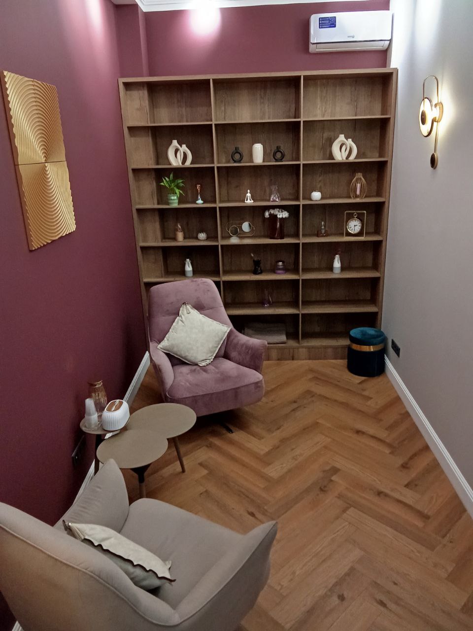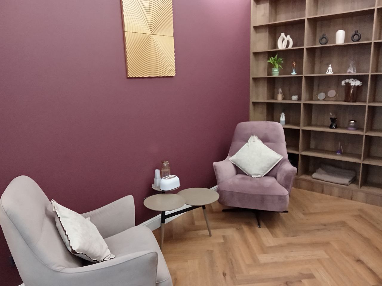 Общая цветовая гамма обстановки выдержана в современных интерьерных решениях. В данном кабинете приятно находиться. Стильное, гармоничное и комфортное помещение создает доверительную, свободную обстановку. Поэтому посетитель, который пришел на прием к психологу, уверенно и спокойно может обсудить все существующие проблемы.
