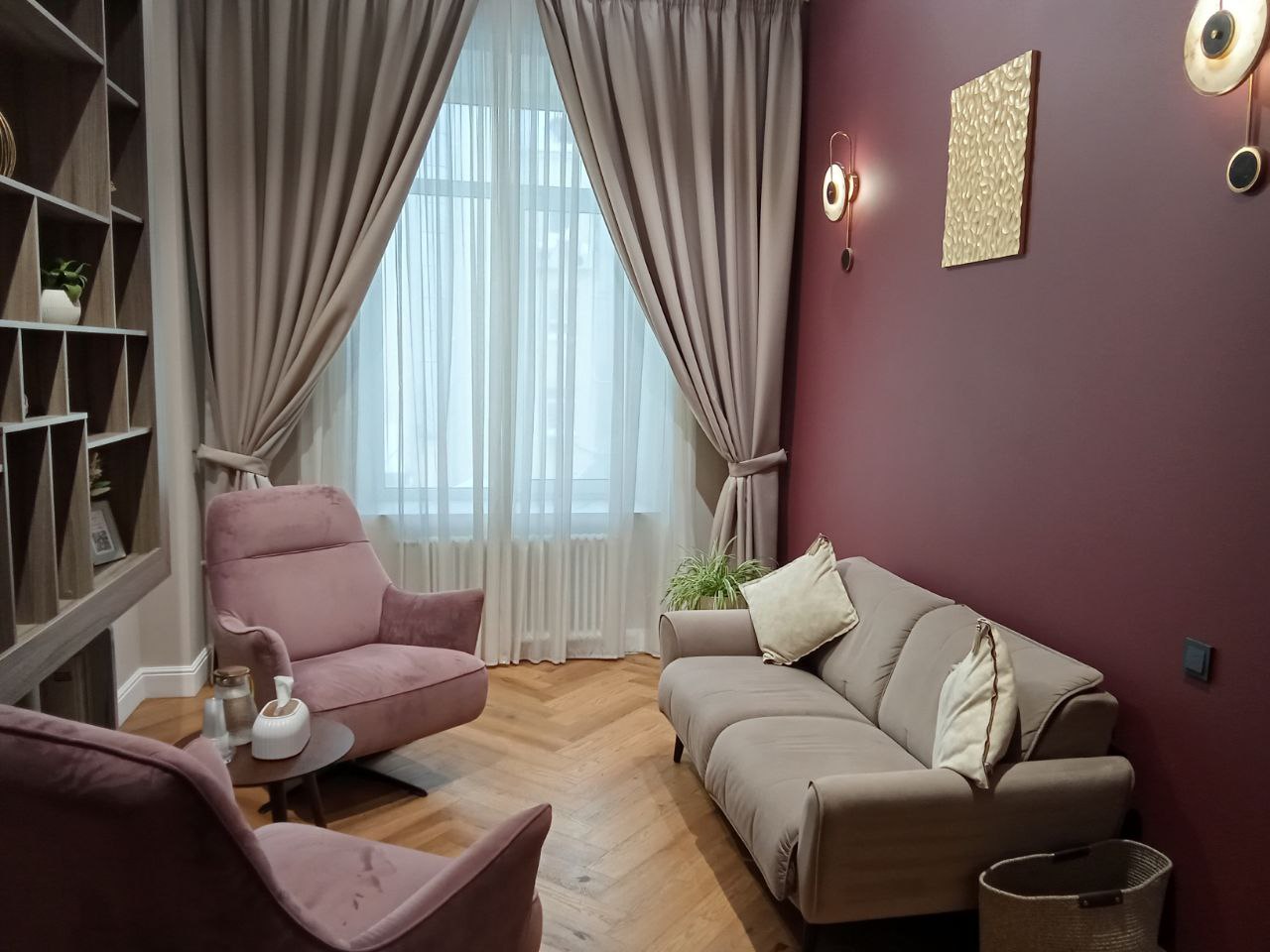 Общая цветовая гамма обстановки выдержана в современных интерьерных решениях. В данном кабинете приятно находиться. Стильное, гармоничное и комфортное помещение создает доверительную, свободную обстановку. Поэтому посетитель, который пришел на прием к психологу, уверенно и спокойно может обсудить все существующие проблемы.