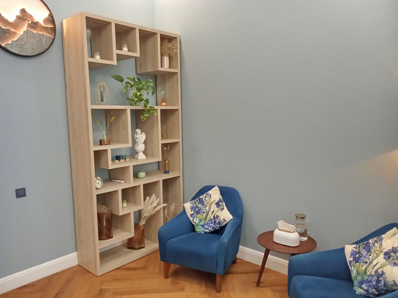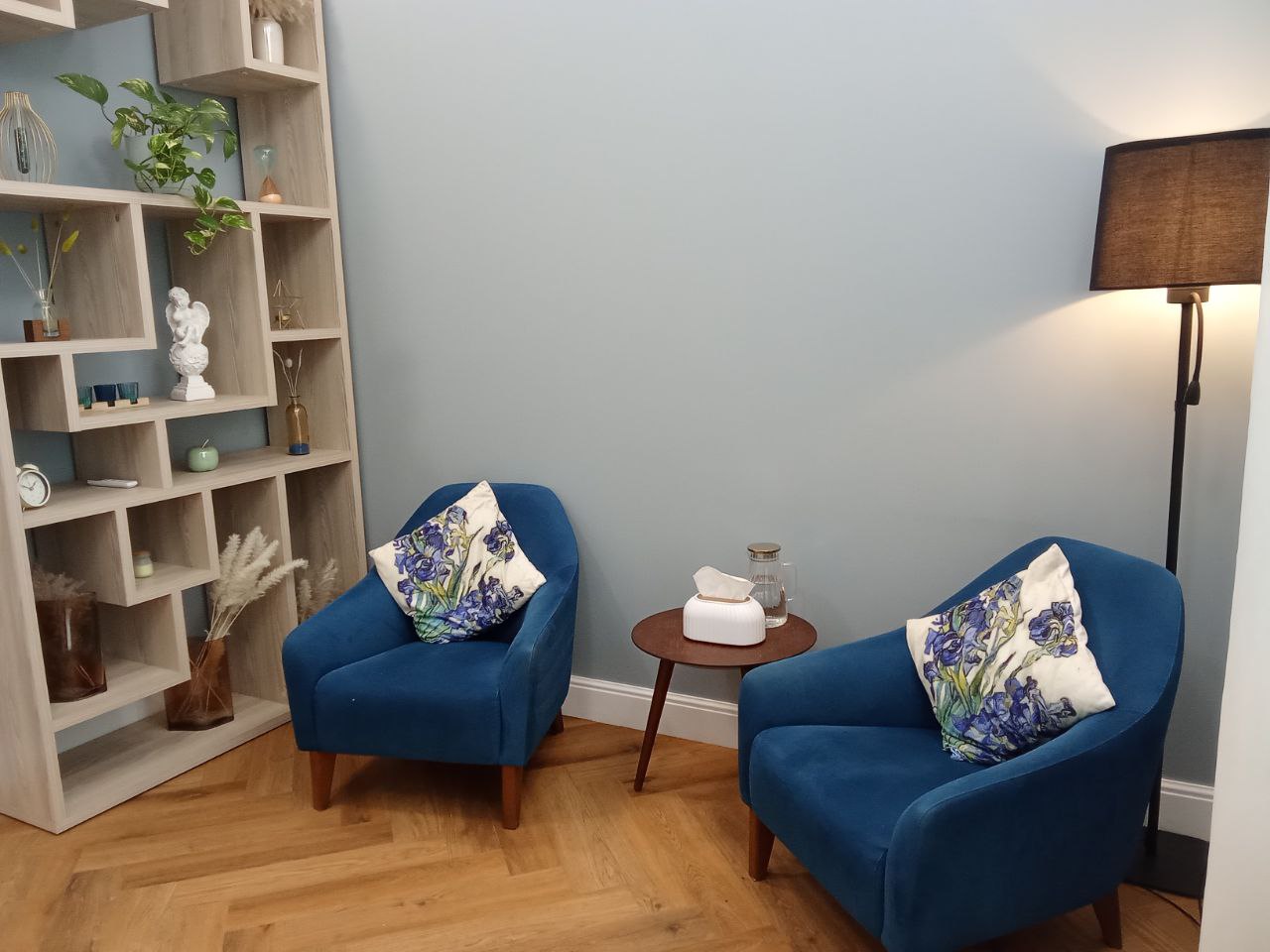 Общая цветовая гамма обстановки выдержана в современных интерьерных решениях. В данном кабинете приятно находиться. Стильное, гармоничное и комфортное помещение создает доверительную, свободную обстановку. Поэтому посетитель, который пришел на прием к психологу, уверенно и спокойно может обсудить все существующие проблемы.